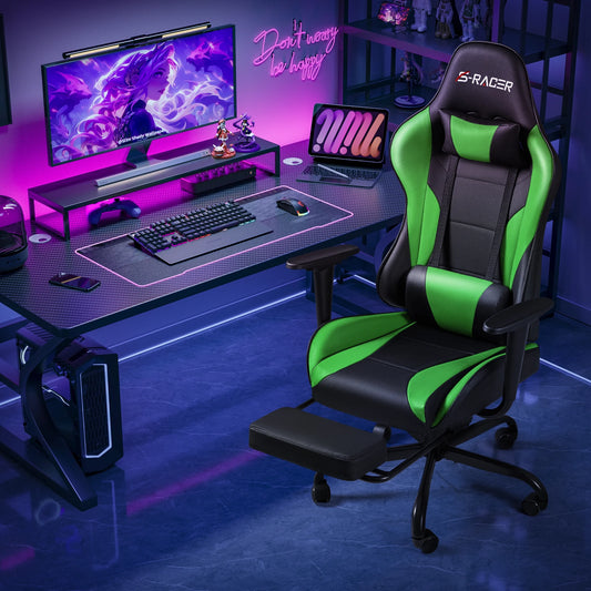 Gaming Chair Massage Office Chair High Back PU Leather Chair with Footrest, Green